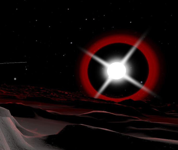 Instance-001 is a "moon" with Red and White areas on it which are illuminated by a "sun" with a red ring.