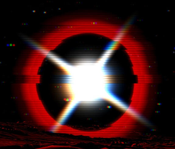 Instance-001 is a "moon" with Red and White areas on it which are illuminated by a "sun" with a red ring.